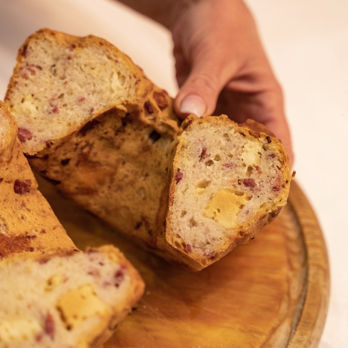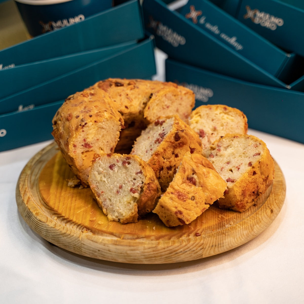 Ingredienti: Farina 00, acqua, lievito madre, sale, Caciocavallo Podolico, salame napoletano, pancetta paesana, Pecorino Romano, Grana Padano, olio di girasole